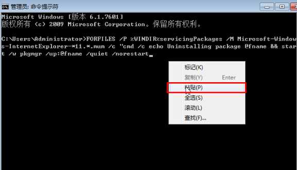 3、在命令提示符中按照不同瀏覽器版本輸入卸載代碼,復(fù)制起來,在命令提示符框中單擊右鍵,選擇“粘貼”,按下回車鍵即可將其卸載了