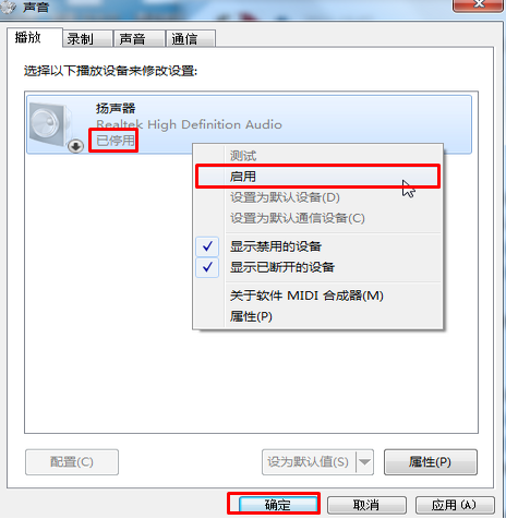 2、在播放設(shè)備選項(xiàng)框中,如果看見如圖的設(shè)備停用,就右鍵選擇啟用