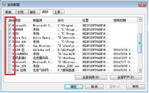 2、打開(kāi)系統(tǒng)配置程序生,在啟動(dòng)一項(xiàng)中,我們可以取消勾選那些不需要開(kāi)機(jī)啟動(dòng)的程序,然后確定;