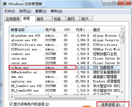 2、切換到進程選項卡頁,在進程中找到ctfmon.exe 選擇并結(jié)束該進程;