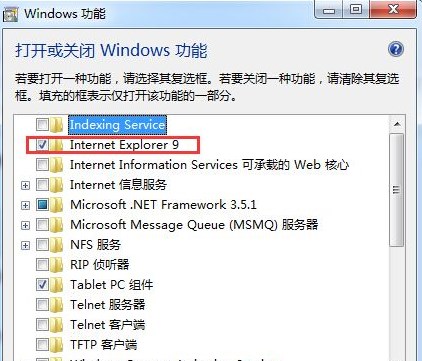 3、卸載完成后,我們重新把 Internet Explorer 勾選,然后確定,重新安裝上IE瀏覽器。