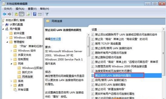 5、修改好上面一項后,我們還需要設(shè)置一項,找到“禁止訪問LAN連接組件的屬性”,同樣雙擊打開;