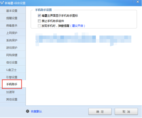 首先我們將新毒霸升級(jí)至最新版之后,在新毒霸綜合設(shè)置里面,有手機(jī)助手設(shè)置選項(xiàng),如下圖所示:
