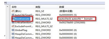 3、然后在窗口右側(cè)找到“BootExecute”并雙擊打開,然后將數(shù)值數(shù)據(jù)中的“autocheck autochk *”刪除,點(diǎn)擊確定,重啟計(jì)算機(jī)即可