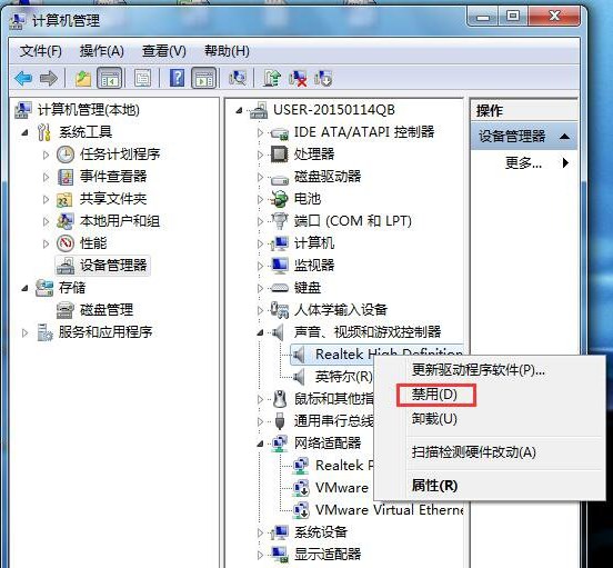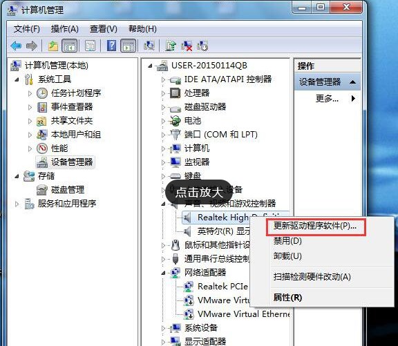 視頻雙方右擊“計(jì)算機(jī)”圖標(biāo),在出現(xiàn)的上下文菜單中選擇“管理”,打開“計(jì)算機(jī)管理”窗體后定位到“系統(tǒng)工具 -》 設(shè)備管理器 -》 聲音、視頻和。。。”下,如圖所示。