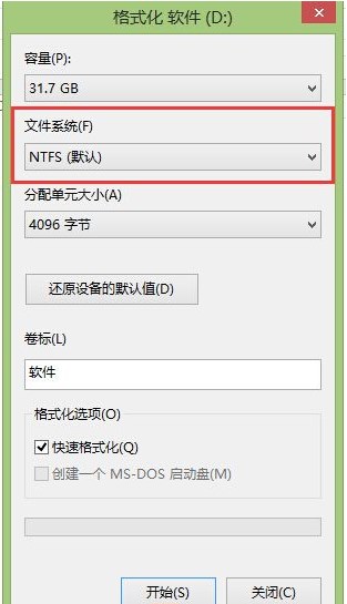 3、格式化窗口出來之后,將文件系統(tǒng) 設置為 NTFS ,然后勾選快速格式化,并點擊確定;