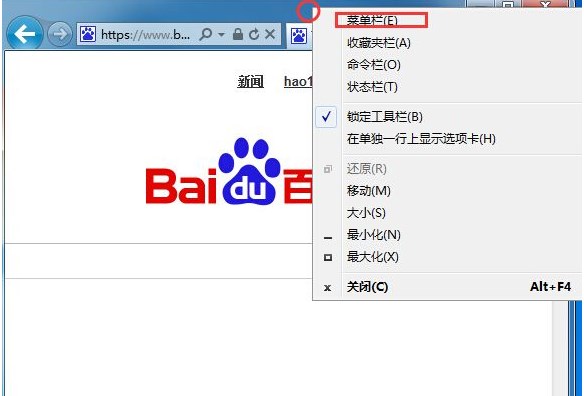 方法一、我們打開IE后,在IE瀏覽器頂部點擊鼠標右鍵,然后在彈出的右鍵菜單中,勾選“菜單欄”,如下圖