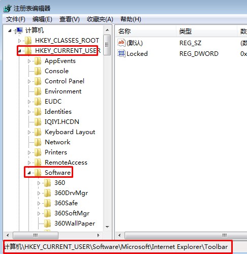 2、定位到 HKEY_CURRENT_USER\Software\Microsoft\Internet Explorer\Toolbar: