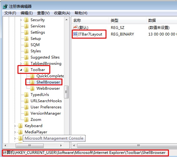 3、在 Toolbar 中打開 Explorer 子鍵,將這里的二進制值 ITBarLayout 刪除即可