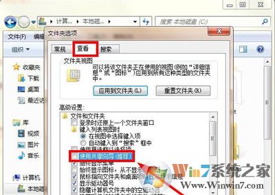 2、打開(kāi)之后,選擇“查看”選項(xiàng)卡,將“使用共享向?qū)Вㄍ扑])”前面的勾去掉,確定,如圖所示: