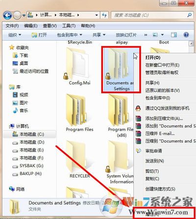 3、在右鍵點(diǎn)擊“Documents and Setting文件夾”,彈出下拉菜單,點(diǎn)擊“屬性”,如圖所示: