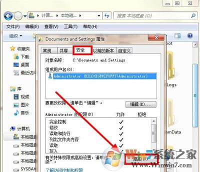 4、彈出“Documents and Setting”屬性界面,選擇“安全”選項(xiàng)卡,再點(diǎn)擊“高級(jí)”,如圖所示:
