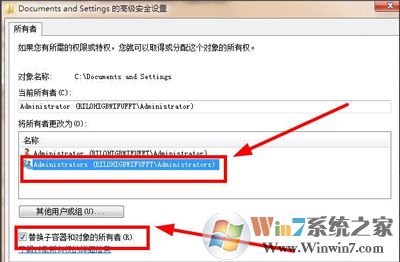 6、打開(kāi)界面后,將管理員組選上,然后將下放的“替換容器和對(duì)象的所有者”前面的勾選上,確定,如圖所示: