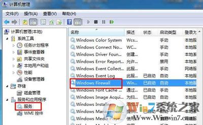 2、之后會(huì)來(lái)到“計(jì)算機(jī)管理”頁(yè)面,展開(kāi)“服務(wù)和應(yīng)用程序”,點(diǎn)擊“服務(wù)”,然后在右側(cè)的服務(wù)列表中找到“windows Firewall”服務(wù),雙擊打開(kāi);