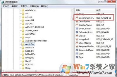 2、來到注冊表編輯器窗口后,在左側(cè)依次展開“HKEY_LOCAL_MACHINE/SYSTEM/CurrentControlSet/Services/Audiosrv”,然后在右邊窗口找到“DependOnService”字符串值,并雙擊打開;