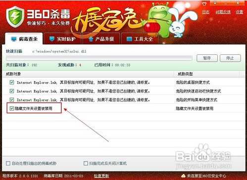 2、如果進入不了安全模式,也沒關(guān)系,可以在系統(tǒng)中直接啟動殺毒軟件的全盤殺毒功能,同時啟用頑固木馬清除,兩個同開,然后再開啟360殺毒進行全盤掃描,那么病毒最終也能被清除。清除之后有時候會有一個后遺癥,那就是隱藏的文件夾無法顯示,即使我們在文件夾選項里去設(shè)置顯示所有隱藏文件也沒有用,因為你會發(fā)現(xiàn)你改了,點了確定后它又被改回不顯示了。我們接下去看下面的步驟、