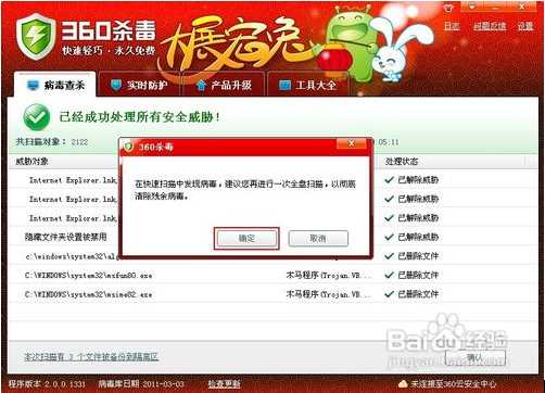 1、如果你的殺毒軟件是升級是在半年左右的時間內(nèi)升級的,那到恭喜你,你的電腦還有救,趕緊重啟進入安全模式殺毒,當(dāng)然還可以下載頑固木馬清除軟件來清除,還可以通過360安全衛(wèi)士來清除。