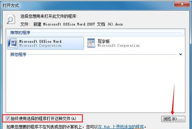 2、打開(kāi)選擇默認(rèn)程序窗口后,我們可以看一下在推薦里有沒(méi)有打開(kāi)該類(lèi)型文件的程序,如果有的話(huà)直接選擇,沒(méi)有的話(huà)還在以在“其他程序”或?yàn)g覽找到你需要的軟件,并勾選“始終使用選擇的程序來(lái)打開(kāi)該類(lèi)型文件”選項(xiàng),確定即可。