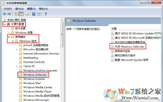 二、 在彈出的本地組策略編輯器中,依次展開(kāi)“計(jì)算機(jī)配置管理模板→Windows組件→Windows Defender”,然后在右側(cè)窗口雙擊打開(kāi)“關(guān)閉Windows Defende”。