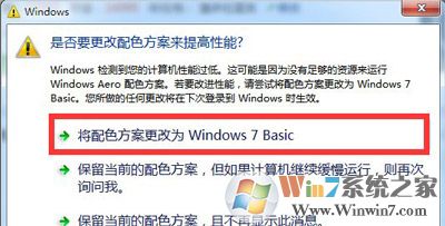 1、當(dāng)電腦性能較差或電腦硬件配置較低時(shí),建議關(guān)閉Windows Aero配色方案。通過在彈出的窗口中點(diǎn)擊“將配色方案更改為Windows7 Basic”按鈕來實(shí)現(xiàn)切換。