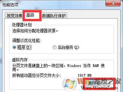 6、此時(shí)將打開“性能選項(xiàng)”窗口,切換到“高級(jí)”選項(xiàng)卡,點(diǎn)擊“虛擬內(nèi)存 更改”按鈕。如圖所示: