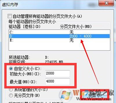 7、從打開的“虛擬內(nèi)存”窗口中,選擇要?jiǎng)?chuàng)建內(nèi)存的分區(qū),勾選“自定義大小”,在此設(shè)置虛擬內(nèi)存大小為實(shí)際物理內(nèi)存的2至4倍即可,點(diǎn)擊“更改”按鈕即可應(yīng)用。