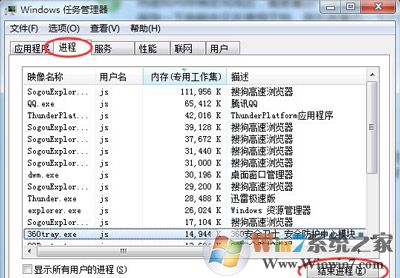 10、從打開的“Windows任務(wù)管理器”窗口中,切換到“進(jìn)程”選項(xiàng)卡,找到占用系統(tǒng)資源較多的進(jìn)程,選中并結(jié)束即可。
