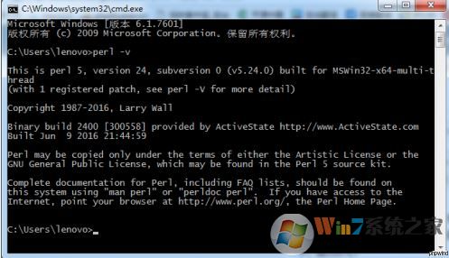 3、安裝完成后,按下win+R 打開運(yùn)行,輸入:cmd 點(diǎn)擊確定打開命令提示符,然后輸入perl -v,按回車,出現(xiàn)下面顯示內(nèi)容,就是成功的:
