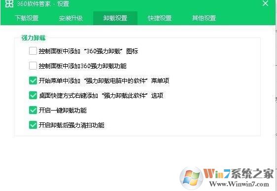 2、隨后會進入“360軟件管家- 設置”窗口,切換到“卸載設置”選項,在下面將“控制面板中添加360強力卸載圖標”和“控制面板中添加360強力卸載功能”兩項的勾選狀態(tài)取消,如果不想右鍵菜單有此選項,那么也可以取消勾選“桌面快捷方式右鍵添加“強力卸載此軟件”的選項”