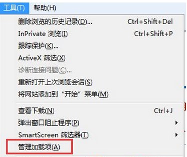 1、打開(kāi)IE瀏覽器,然后點(diǎn)擊“工具”——“管理加載項(xiàng)”,如下圖:
