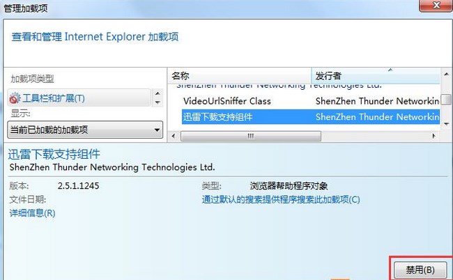 2、在管理加載項(xiàng)中“工具和擴(kuò)展”下找到“迅雷下載支持組件”,選擇后單擊“禁 用”按鈕;