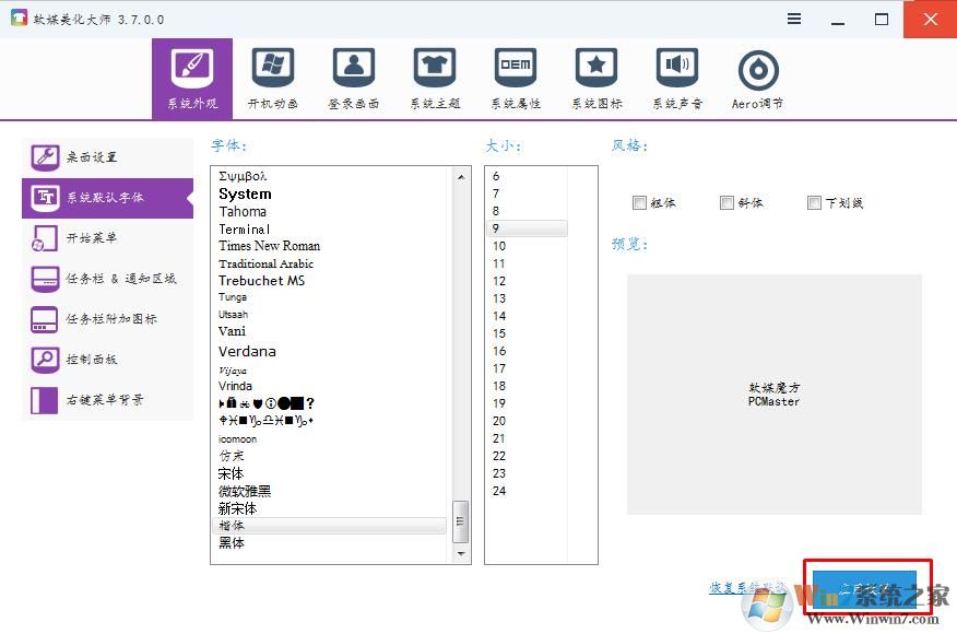 3、如上圖,我們選擇 系統(tǒng)默認(rèn)字體,然后在側(cè)右選擇你已經(jīng)安裝的字體(沒有安裝的不出現(xiàn),不會(huì)安裝的參考:設(shè)計(jì)老手教你怎么給Win7安裝字體|win7字體安裝教程)選擇好字體和大小之后應(yīng)用設(shè)置;