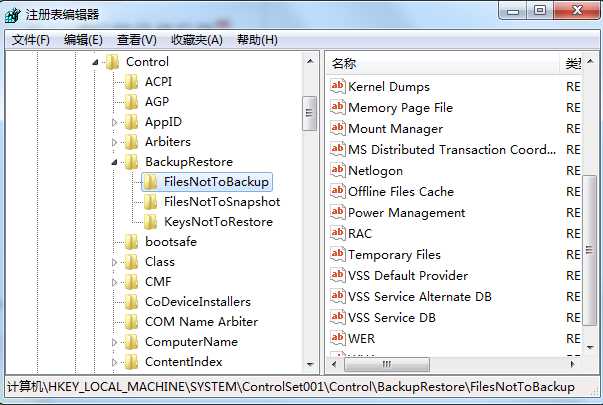 2、找到[HKEY_LOCAL_MACHINE\SYSTEM\ControlSet001\Control\BackupRestore\FilesNotToBackup]\PowerManagement
