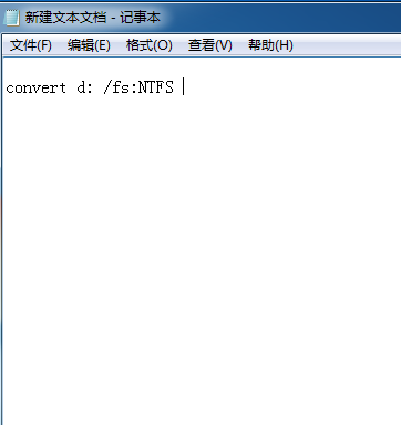 1,打開文本文檔,輸入 convert d: /fs:NTFS 來對(duì)D盤進(jìn)行轉(zhuǎn)換,如果是E盤那么就把D改成E;