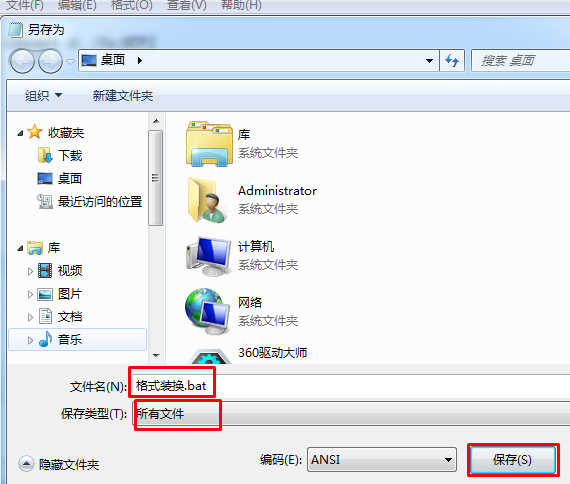 2、另存為 格式轉(zhuǎn)換.bat 保存到桌面,文件格式選擇為全部