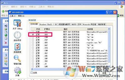 6、在右側(cè)的文件關(guān)聯(lián)下,勾選“.exe”類型復(fù)選框,好,這里先停一停,但是,不要關(guān)閉這個程序,一定要留著它,記得啊。