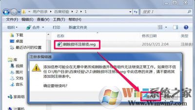 9、制成這個注冊文件的意思是先刪除注冊表中被損壞的注冊項,雙擊“刪除損壞注冊項.reg”這個文件,將其導(dǎo)入注冊表。