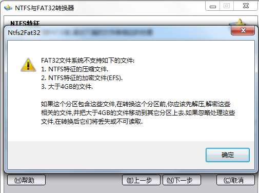 5、出現(xiàn)以下提示,請先把單個文件大于4G的放到其他磁盤中~不然轉換后是會損壞的。