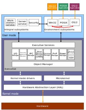 Windows NT采用的核心是屬于混合核心。其體系結(jié)構(gòu)包括簡單內(nèi)核、硬件抽象層(HAL)、驅(qū)動程序、服務(wù)(總稱為運行體), 這些均屬于核心模式。用戶模式下的程序與子系統(tǒng)僅能訪問其可訪問的資源,核心模式下的程序則可以訪問所有資源與外部設(shè)備。