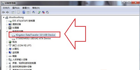 2、打開設(shè)備管理器之后,在窗口中找到“磁盤驅(qū)動(dòng)器”并展開,在列表中可以看到U盤驅(qū)動(dòng)程序(如圖),并雙擊打開,(可以看見自己u盤的名字在里面,一定要找到自己的u盤,不然很多設(shè)置錯(cuò)了就沒什么作用了);