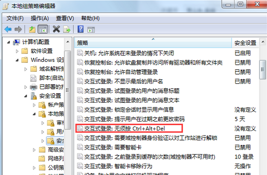 2、打開本地組策略編輯器后,依次展開點擊“windows設(shè)置”—“安全設(shè)置”—“本地策略”—“安全選項”,點擊“安全選項”,在右側(cè)找到“交互式登錄;無須按Ctrl+Alt+Delete”并雙擊。