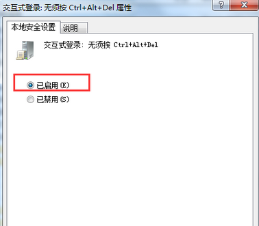 3、最后,將“交互式登錄;無須按Ctrl+Alt+Delete”界面中,設(shè)置為“已啟用”,再按“確定”。