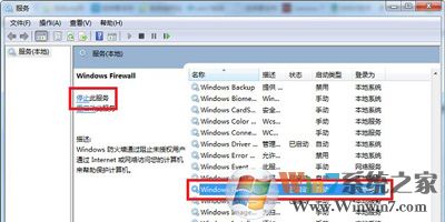 2、在服務(wù)列表中找到防火墻服務(wù)“windows firewall”,選中后點擊“停止”即可。
