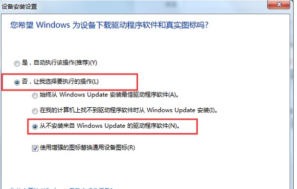 4、將“是,自動執(zhí)行該操作”改為“否,讓我選擇要的操作”,然后選擇“從不安裝來自Windows updata的驅(qū)動程序軟件”,再確定!