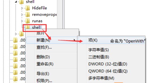 3、點(diǎn)擊“shell”項之后,我們在"shell"項上右鍵,然后"新建"—“項”,命名為“OpenWith”;