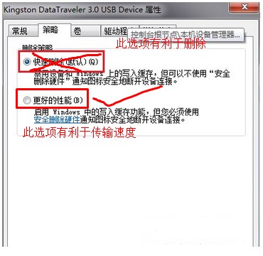 2、看看是不是將U盤在win7系統(tǒng)中設(shè)置成了快速刪除模式,如果是我們就打開更好的性能這個(gè)模式。具體教程看win7系統(tǒng)在怎么設(shè)置拔下u盤不用安全刪除步驟是一樣的,只要選擇更好的模式即可