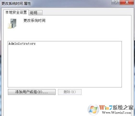 4、在打開的更改系統(tǒng)時(shí)間屬性窗口,我們點(diǎn)擊:添加用戶或組(U)。