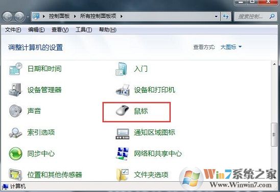2、進(jìn)入控制面板后,在“查看方式”為大圖標(biāo)或者小圖標(biāo)的情況下,點(diǎn)擊打開(kāi)“鼠標(biāo)”;