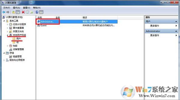 2、進(jìn)入計算機(jī)管理窗口后,在左側(cè)依次展開“系統(tǒng)工具--本地用戶和組--用戶”,然后雙擊打開右側(cè)的管理員用戶“administrator”;