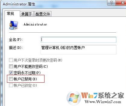 3、之后會打開“administrator屬性”窗口,發(fā)現(xiàn)該帳戶已禁用被勾選上了,把“帳戶已禁用”取消,然后點擊確定;